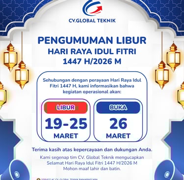 Setelah menjalani masa libur dalam rangka perayaan Hari Raya Idul Fitri 1447 H, kami dengan senang hati menginformasikan bahwa CV Global Teknik resmi kembali beroperasi mulai hari ini, 26 Maret.